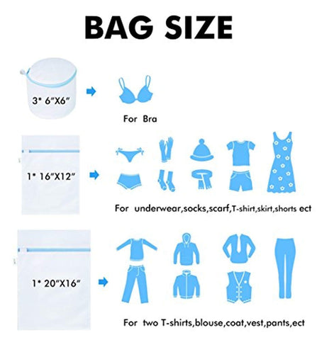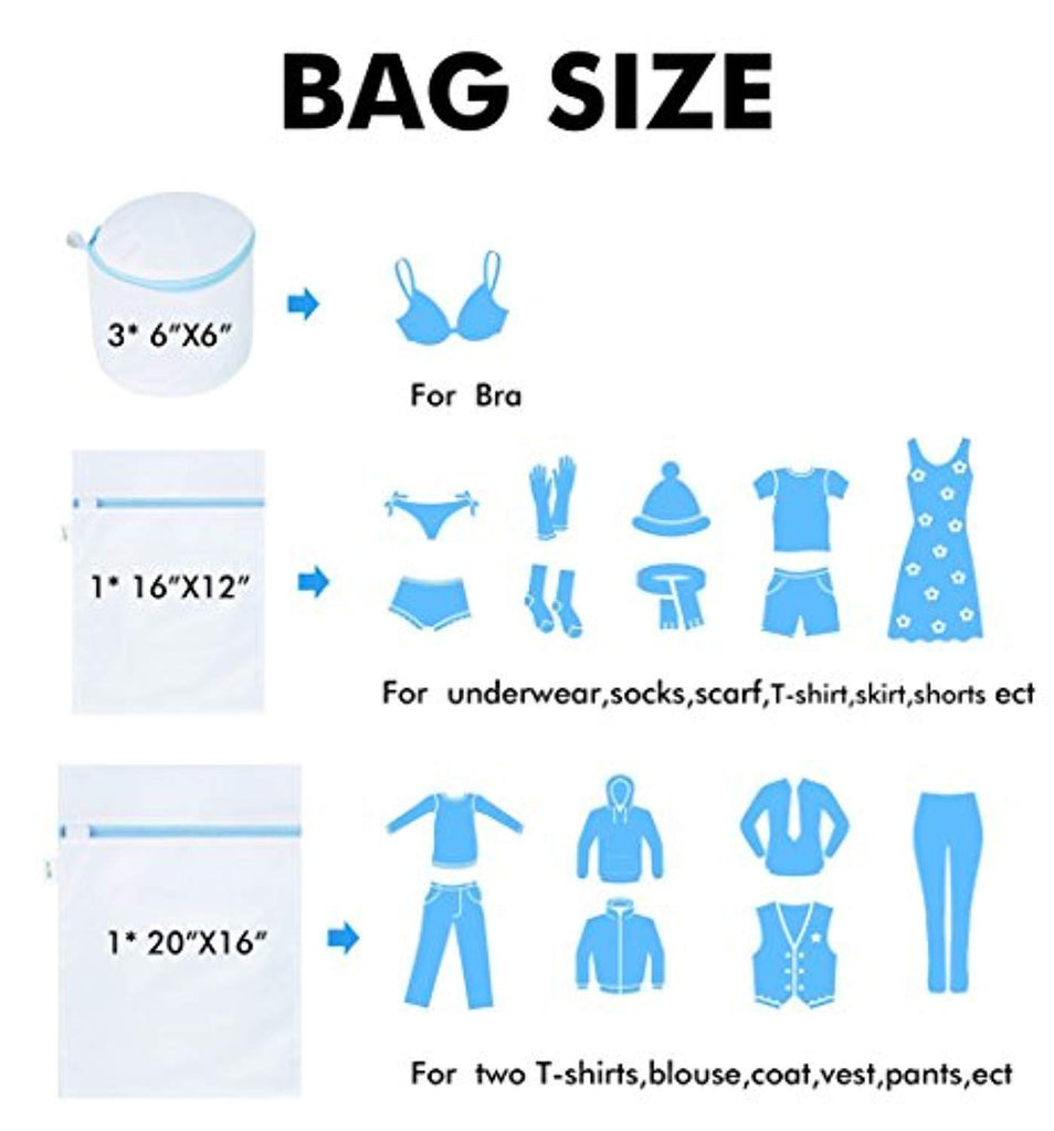 • 【100% Satisfaction Guarantee】 -One year warranty and 30 days money back provide to this 5 pack laundry bag(3pack bra bag:6*6 inch,1pack laundry bag:20*16 inch,1pack laundry bag:16*12inch)