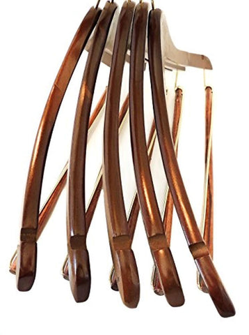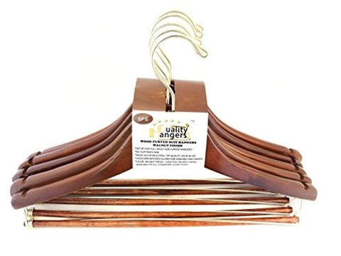 Extremely High Quality Set of Five full adult size Curved hanger with shoulders. Made out of beautiful top quality solid wood with a beautiful Walnut Finish. Shoulder notches allows for hanging thin straps on coats hanger. NO-SLIP pants Bar coat hangers.