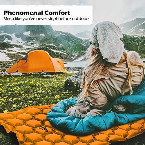 LIVE YOUR LIFE TO THE FULLEST: It's time to plan a trip! The camp mat cannot be easier to inflate than with our inflating bag. It has a dual action, non-leak air valve, to inflate and deflate the mattress. Being light & small when packed, it won't cause backaches from its weight, and it fits easily in your backpack. Being insulated, it's perfect for the best night of sleep during any type of adventure, whether it be hiking, camping, backpacking, and more, in any weather!