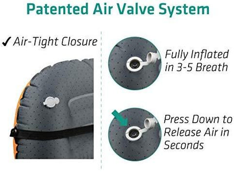 EASE OF USE! With the simple click of a button, Inflate pillow by mouth with approximately 3-5 breaths. Once you are done you can conveniently deflate the pillow with the Quick Deflate feature which rapidly releases air after use in only seconds. With the unique technology in this compact and light pillow, you are able to adjust firmness to your personal sleep preference. You can Rest easy with our 100% Satisfaction Guarantee!