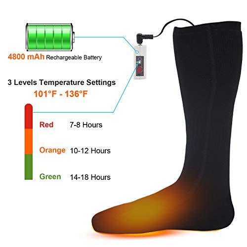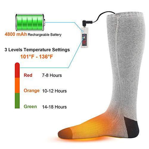 ❄️ 3-Level Temperature Settings (101℉- 136℉): High [heat 7-8h], Medium [heat 10-12h] & Low [heat 14-18h]. The heated socks get warm in about 1 minute. (WARM REMINDER: Long high-temperature heating will hurt your feet, please turn down the heating temperature gradually while using.)