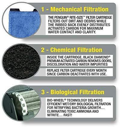 Certified flow rate of 200GPH, perfect for all aquariums up to 50-gallon, uses the Rite-Size C filter cartridge Delivers easy, three stage mechanical, chemical, and biological aquarium filtration Convenient Penguin Rite Size Cartridges come ready to use with each filter Please refer the Product Manual, Set up Manual and the Instructional Video before use