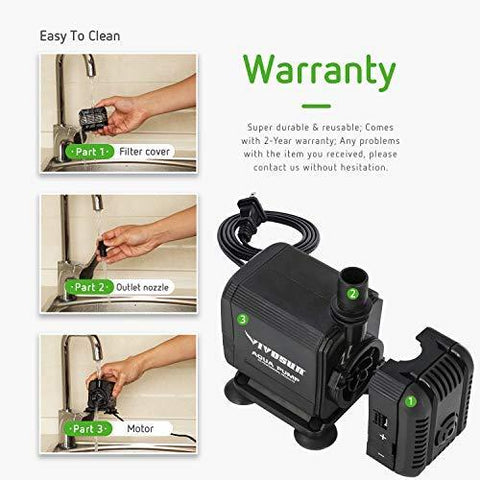 【Specifications】Dimensions: 4.1*2.6*3.5inch. The 5ft long power cord offers convenient installation. An Adjustable Knob to control the water flow rate, so you can get just the amount of water pressure you want. Max Flow Rate: 800 GPH (3000L/H), Max Lift height: up to 10 Feet. Watt: 24W; Voltage:110-120V.
