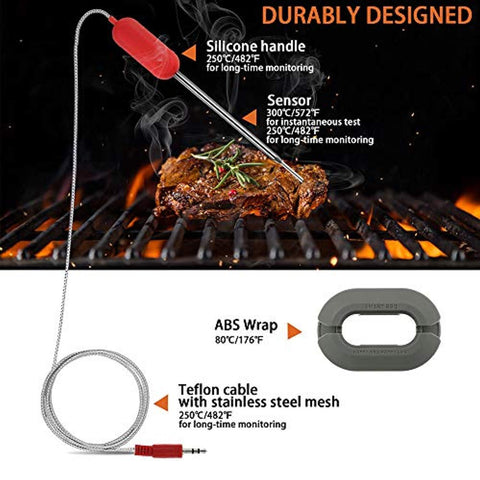 • [6 Probes Works at the Same Time]: Use probes with 6 different color markers, Wireless meat thermometer for grilling can monitor 6 different food or read the temperature around the grill/oven/smoker in the mobile phone, You can have a wonderful barbecue in the wild with friends on weekends.