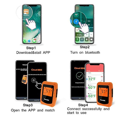 • [App Updated]: Iphone users, please download free APP ”Enjoy_BBQ” from your iphone; Android user,please downlaod App ”Cloud BBQ”from google play, you will get the temperature reading via bluetooth within 196 ft(outdoor)/ 100 ft(indoor) wireless range. You can both control the food temperature and watch TV pleasantly when you cook in the kitchen, don't worry about food will be overheated.