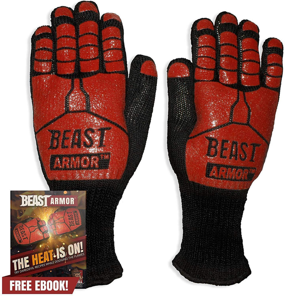 • ♨️FLAME RETARDANT AND HEAT RESISTANT, the Beast Armor Gloves are guaranteed to withstand extreme temperatures up to 982ºF (350ºC). This makes them perfect for grilling, smoking, cooking, baking, or handling super hot items in the kitchen and outdoors. These badass grilling gloves are also machine washable for easy and convenient cleaning.