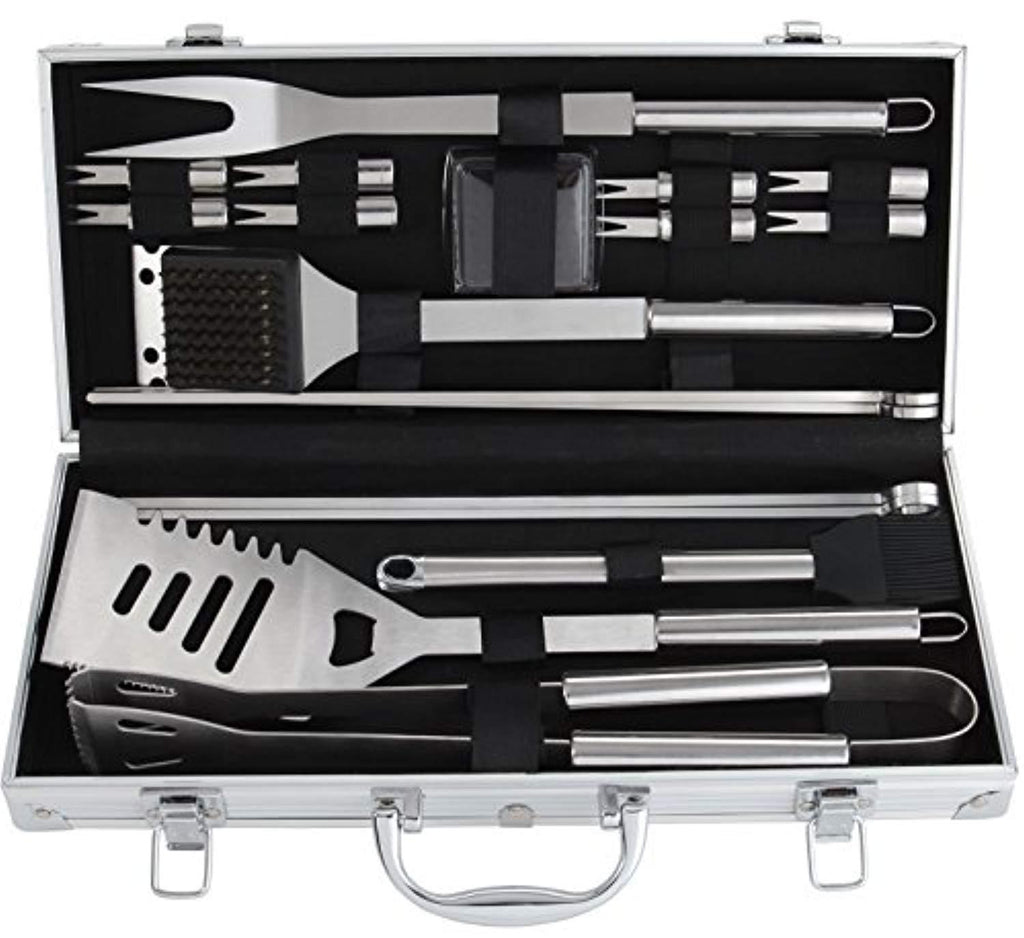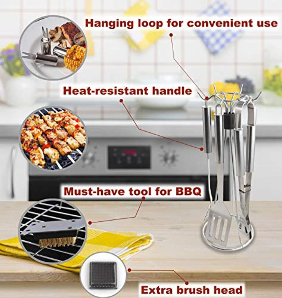 Complete Grill Accessories Kit - Spatula, fork, tongs, basting brush, grill brush, extra brush head, 8 corn holders, 4 skewers. Super Strong and Durable - All barbecue tools are made from professional grade stainless steel that resists heat and stands the test of time. Portable and Convenient Case - Compact size kit is lightweight to carry and storage which is perfect for BBQ, camping, picnics and outdoor cooking. Perfect Gift for Men Dad - Great BBQ grill gift set on father’s day, Christmas, Birthday, Valentine & any happy occasion. 10 YEARS LIMITED MANUFACTURE WARRANTY.