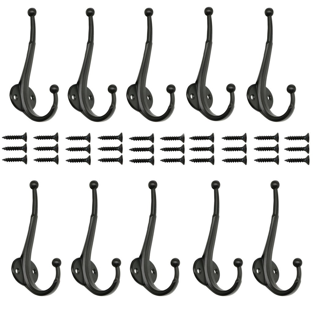 LepoHome 10 Pack Heavy Duty Dual Coat Hooks Wall Mounted with 30 Screws Retro Double Hooks Utility Black Hooks for Coat, Scarf, Bag, Towel, Key, Cap, Cup, Hat