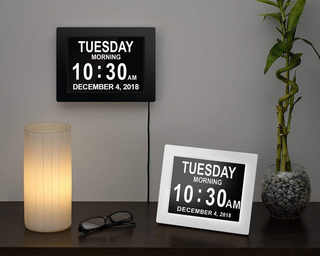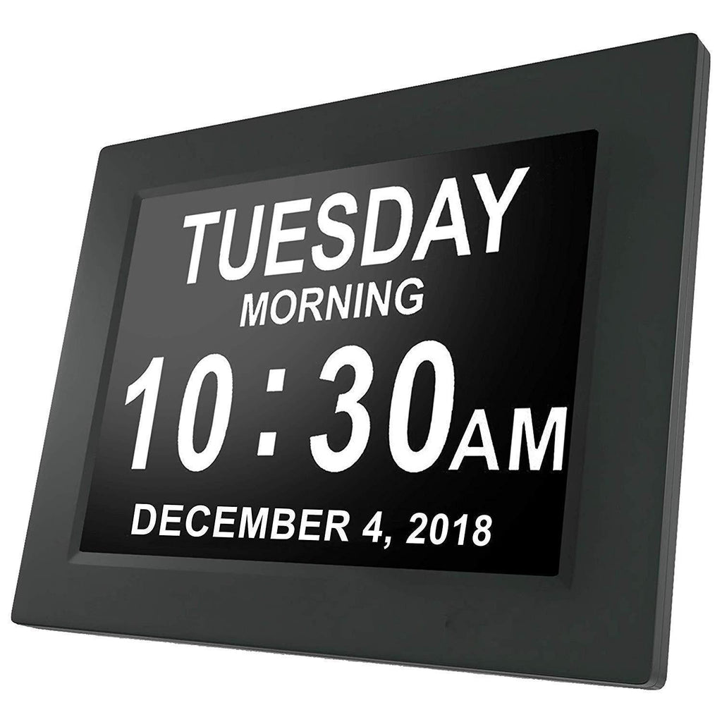 • ✔ KEY FEATURES - This unique 8" High Resolution Digital Alarm Clock clearly spells out the time, period of the day, full day of the week, month and date in large, clear letters - with no confusing abbreviations.