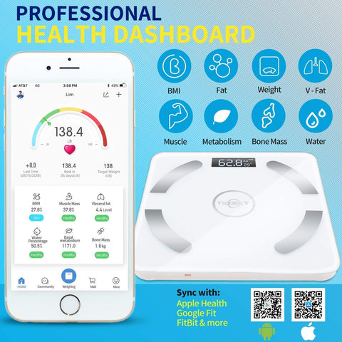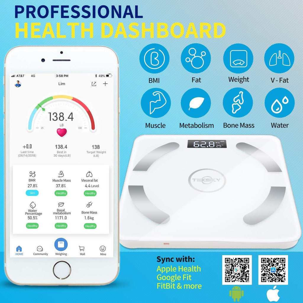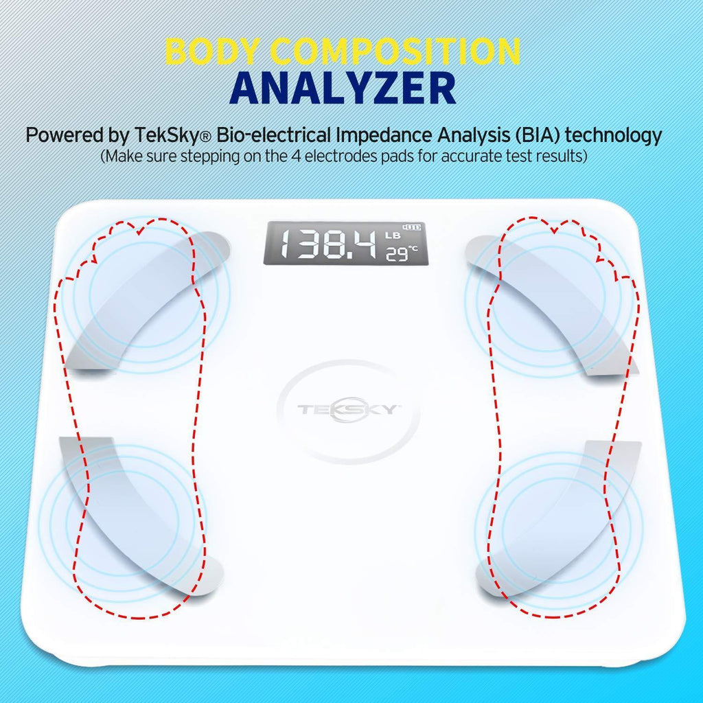 TekSky Smart Body Fat Scale, Wireless Body Composition Monitor with Bluetooth iOS and Android App - Body Fat, Water, Muscle, BMI Analyzer - Max 400 lbs