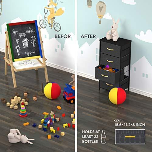 Large Capacity: A good amount of storage with 4 separate drawers shows that you are able to fit about 12-15 rolled up t-shirts or about 6 pairs of jeans in one drawer; Made of Eco-Friendly material, harmless and wipe down easily.