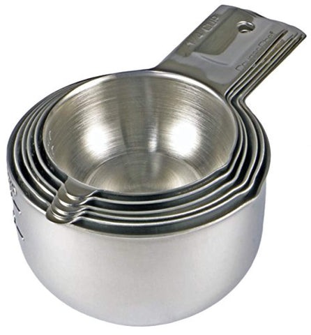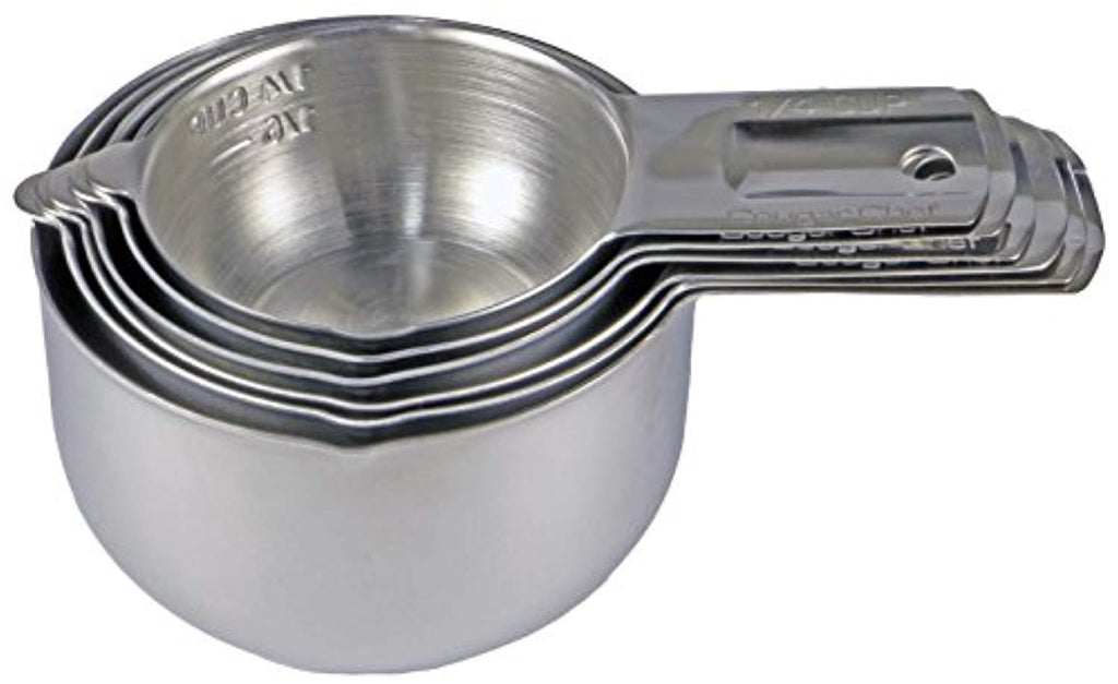 SMART ONE-PIECE DESIGN — Each measuring cup is made from a single piece of stainless steel. There are no rivets or weld joints, and the wide, easy-grip handles will never break or fall off. The cups are stackable and nest into each other for easy, compact storage, and the flat bottom design allows them to sit flat on your counter without tipping over, even when they are empty. Each measuring cup has a pouring spout to ensure dribble-free pouring of liquids.