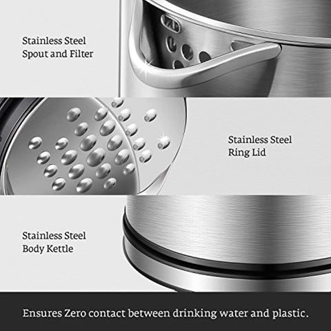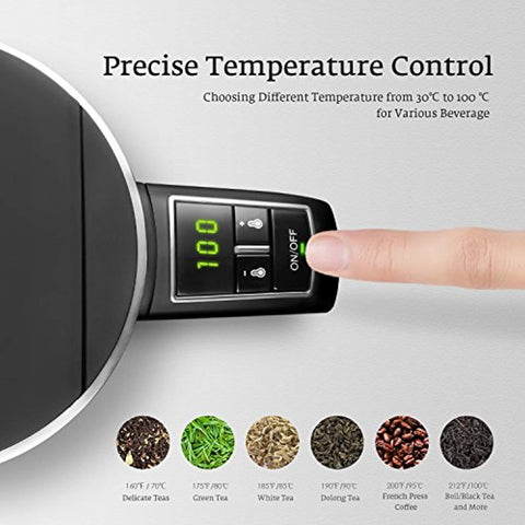 PRECISION TEMPERATURE CONTROLS: LED displays temperature, simple to use and easy to read for hot coffee or tea; A full stainless body kettle guarantees zero plastic contaminating your drinking water, the strong 304 food grade steel kettle provides durability and ensures it won’t break or crack like glass