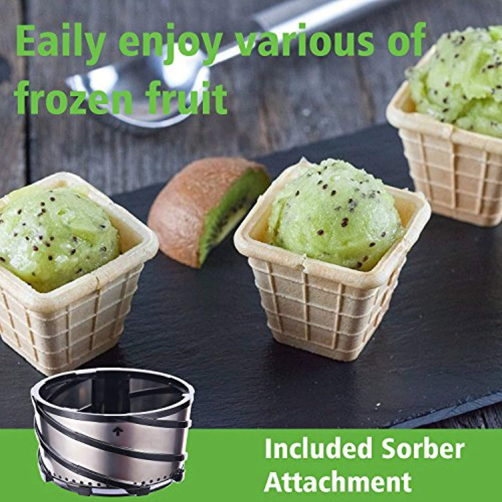 ☛ New Fresh Design - LED Chromed Knob for easy switching between obverse and reverse function,delay starting system and overload protection system for longer product life. Compact cold press juicer saves lots of space in your kitchen and make it easier to storage in cabinet.
