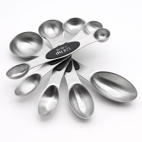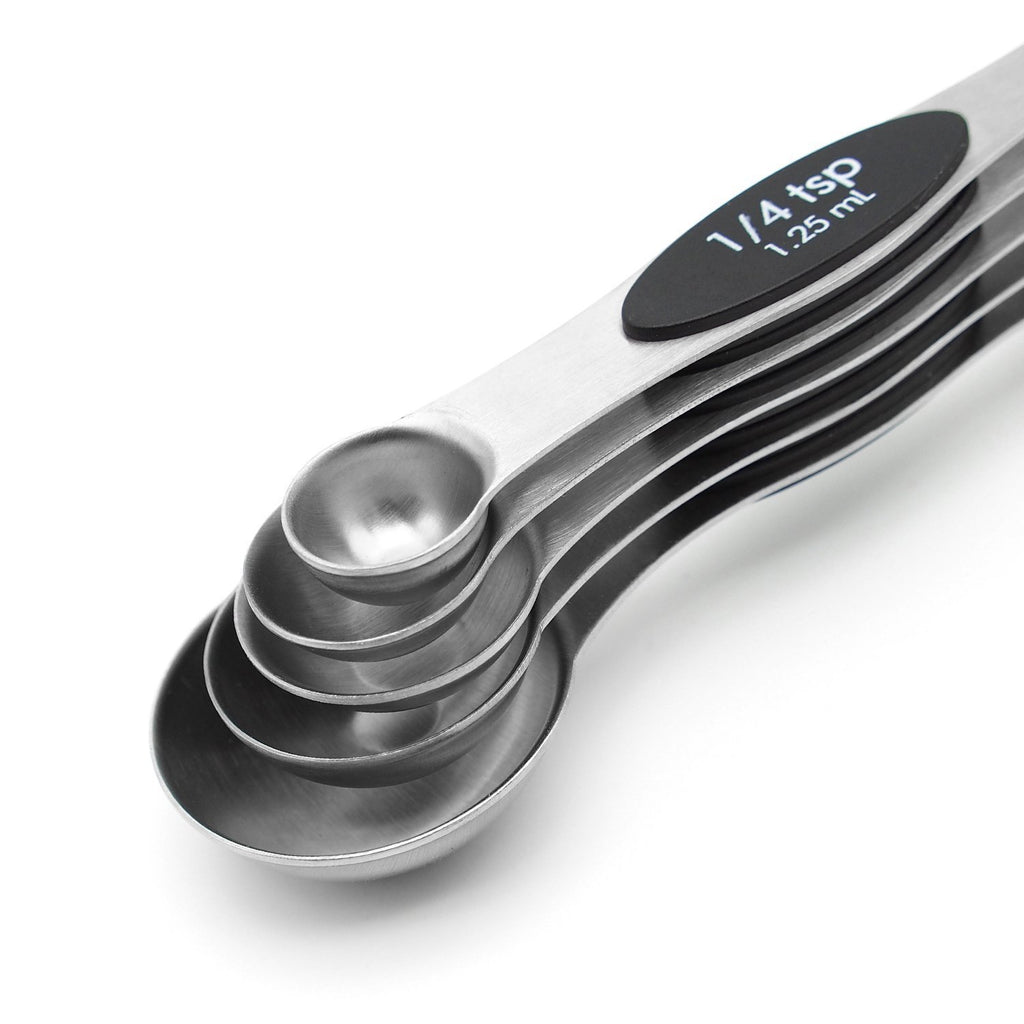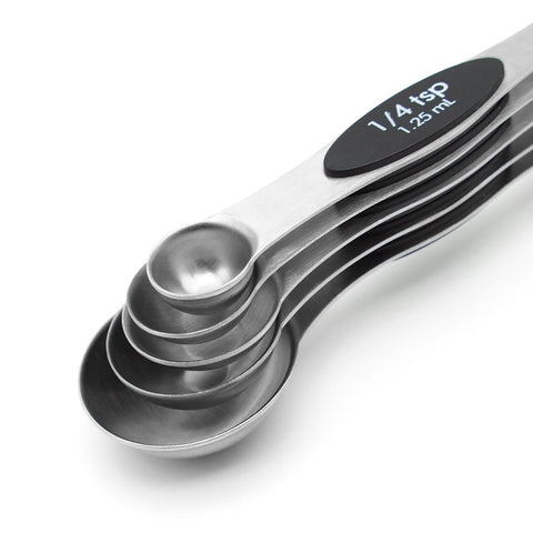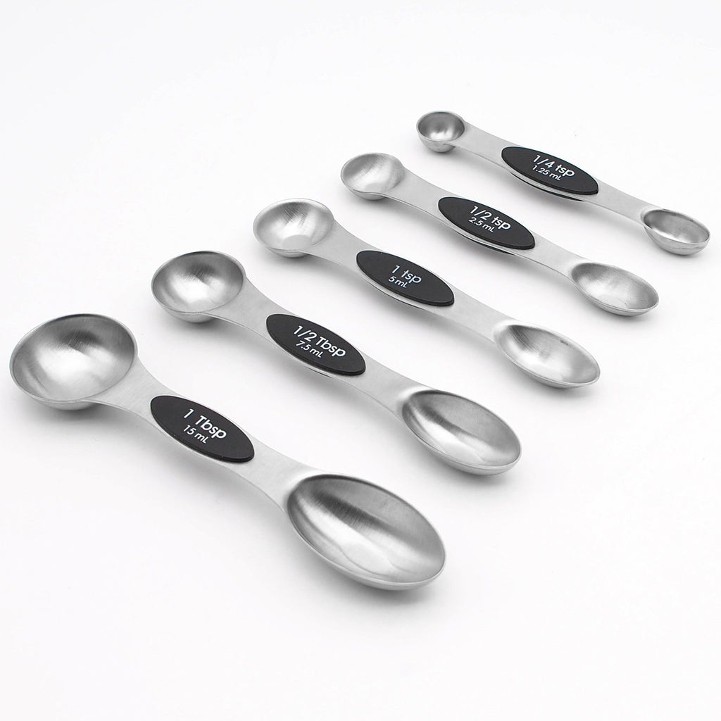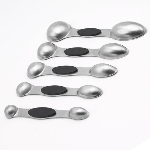 Set of 5 stainless steel magnetic spoons: 1/4 tsp, 1/2 tsp, 1 tsp, 1/2 Tbls, 1 Tbls Narrow end designed for reaching jar, round end suitable for liquid Spoons stack neatly on one another in a bundle,Magnetic in middle of spoon enable each spoon stick together Flat base allows spoons to rest on counter without spilling contents Place in dishwasher for easy and effortless clean up