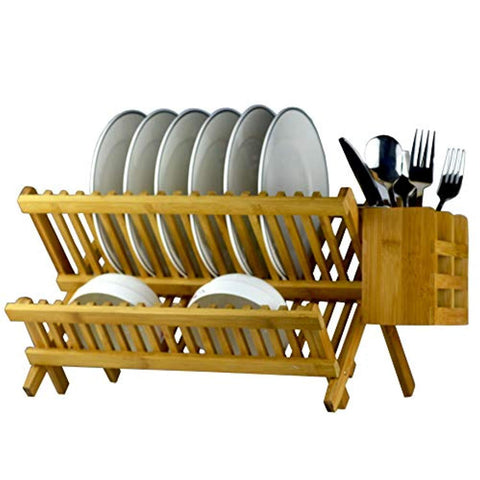 Bamboo Dish Rack 2-Tier Collapsible Drainer Folding Wooden Dish Drying rack with Utensils Flatware Holder set Home Cabinet, 18 Slots