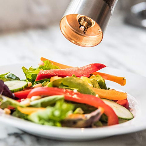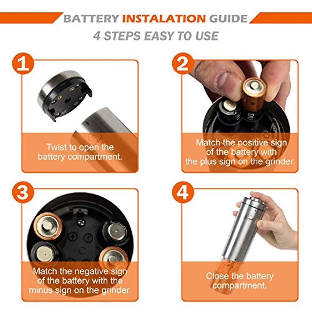 👍EASY TO USE: the rubber caps are easy to attach and keep your table clean; their innovative design keeps them in place and prevents them from falling; easy one hand operation contributes to the optimal performance of the grinder; the automatic mills need 4AA non-rechargeable batteries each, the modern design of the stainless steel salt and pepper grinders allows easy hustle-free replacement of the batteries and the refilling of the condiments