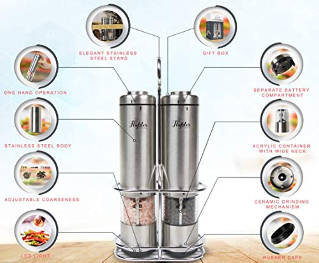 ✔️QUALITY: For the Electric Salt and Pepper Grinder Set Flafster Kitchen (Previously known as Jovial Kitchen) has used the highest quality stainless steel to meet the highest quality standards and make your kitchen look sleek and stylish and ensure premium and unique experience;The electric pepper mills are a necessity for every home; The elegant design and gift box make these battery powered salt&pepper shakers the perfect present for any occasion
