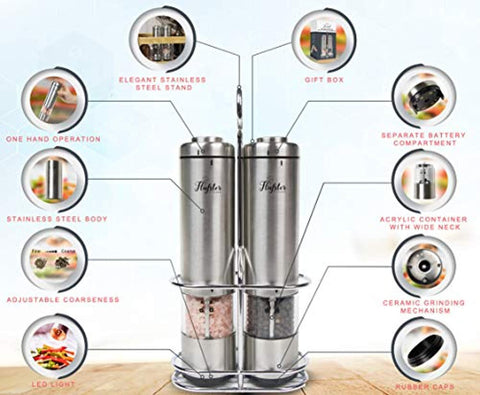 🔝STAINLESS STEEL STAND: Flafster Kitchen is THE ORIGINAL SELLER and the stand is specially designed for this particular electric grinder set and it is durable and easy to clean; It prevents your counter top from getting messy and makes it easier for you to move the grinders around; the stand completes the finished look of the salt and pepper electric mills; dispensing freshly ground salt and pepper has never been easier