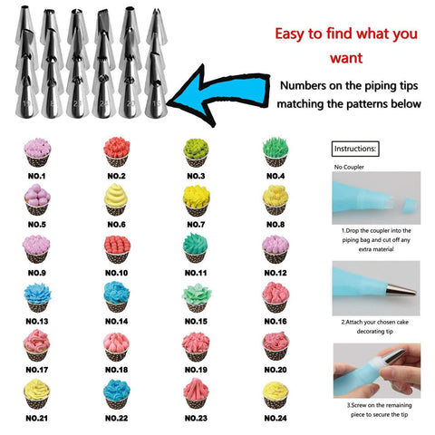• ✅TIPS ARE NUMBERED:Numbers on the piping tips matching the patterns charts on the manual in the box.Good for the beginners to find out their favorite one.
