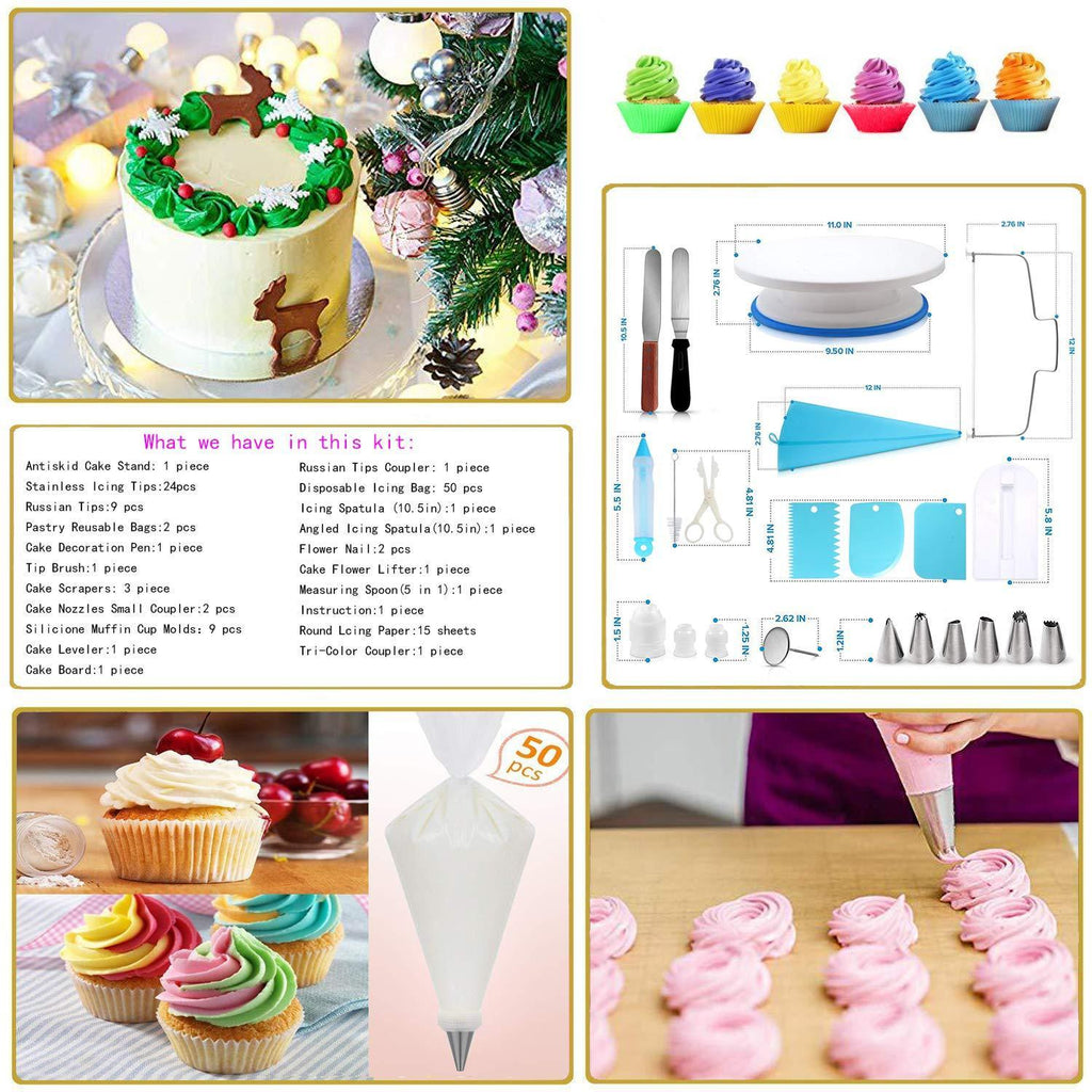 • ✅COMPLETE CAKE DECORATING KIT IN LOW FARE:This cake decorating kit contains everything you need for the cake decorating.128 pcs set is a very reasonable choice for the DIY beginners as well as the baking professionals.