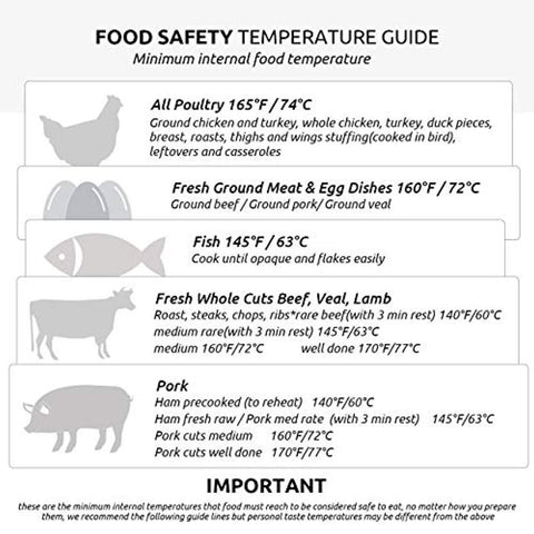 • 【HIGH QUALITY】- The BBQ food meat thermometer's body made of strong ABS plastic, if you drop, the meat thermometer will not deteriorate. The Long probe is made of food grade stainless steel will not break.All materials of the instant read thermometer are completely safe and healthy in your daily life.