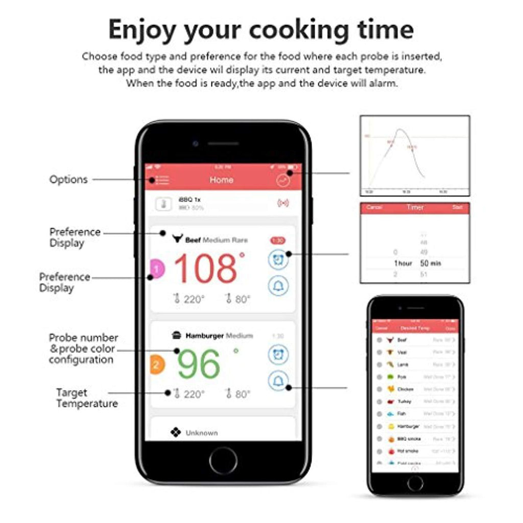• ♥6 CHANNEL PROBES SIMULTANEOUSLY MONITORING ♥This instant read meat thermometer has 6 FOOD GRADE stainless steel probes, which can monitor different meats or grill/smoker temperature same time, 4" food grade stainless steel probe with silicone handle keeps you from burning your hands while measuring.features step-down tip design to get temperature more precisely and quickly.