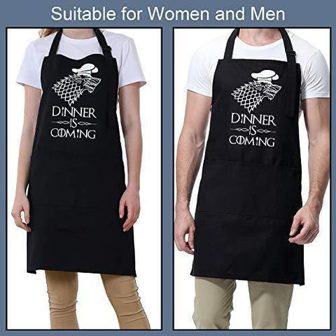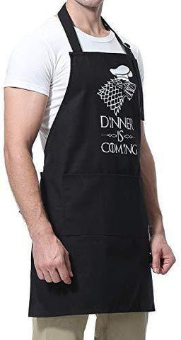 • CUTE APRONS FOR GOT FANS: This GoT inspired saying “Dinner is coming” apron is the perfect cooking gift for the Big GoT cook who loves to grill. Ideal for chef, grill master, baker, waiter, waitress, restaurateur, your mom, mother in law, dad, hubby, fiancée, wife, husband, nanny, grandma, grandpa, yourself, best friends, BFF, girlfriend, boyfriend, sisters, sister in law, brother, brother in law, daughter, son, cousin, aunt, uncle, co-workers, neighbor or any cook lover in your life.