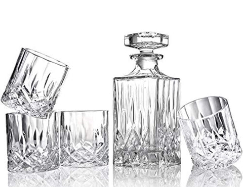 Ornate Whiskey Decanter Set Include Timeless 35 OZ Crystal Whiskey Decanter And 4PC Sophisticated 11 0Z Whiskey Glasses.