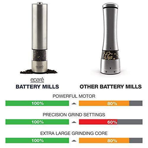 BRIGHT LED LIGHT: At Epare we provide feature-packed kitchen products built to last. We've added a bright LED torch to our powered grinder so you'll be able to see how much seasoning you're adding to your food. Perfect for intimate low-light dinners.