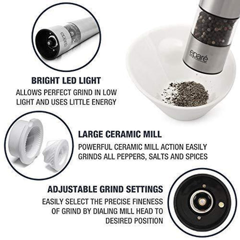 Eparé Salt or Pepper Grinder, Adjustable Ceramic Mill for Pink Himalayan Sea Salts & Black Peppercorns – Battery Powered Steel Electric Spice Shaker – LED Light