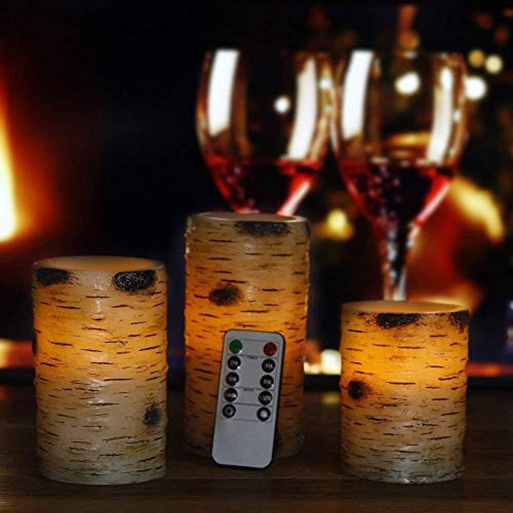 Flickering Flameless Candles with Birch Bark Effect LED Candles 4" 5" 6" Set of 3 Battery Candles Real Wax Pillar with 10-key Remote Control - 2/4/6/8 Hours Timer