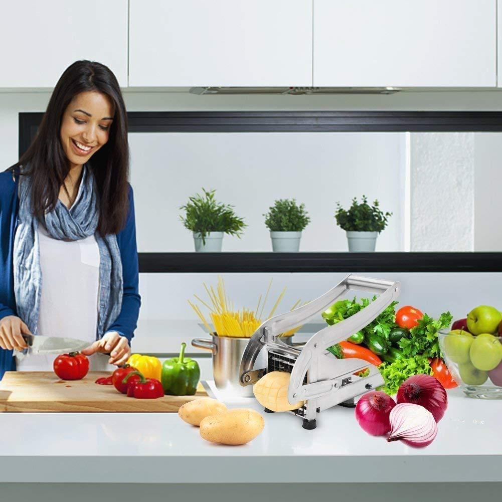 This french fry cutter come with 2 interchangeable sturdy stainless steel blades, you can choose the regular size or thinner gourmet style, great for potatoes,sweet potatoes,onions,cucumbers, apples, zucchinis, radishes, yams, ect