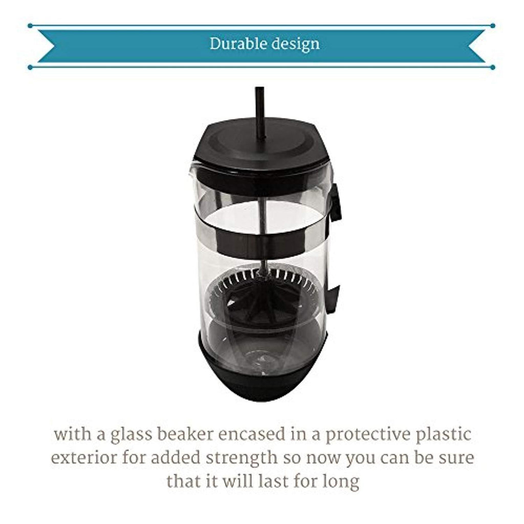 Perfect for your morning cup of coffee or tea Classic, durable design with a glass beaker encased in a protective plastic exterior for added strength Comfortable plastic handle is connected to a metal band for a secure hold Reusable metal mesh filter securely holds coffee grounds and loose leaf teas Holds approximately 12 ounces