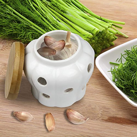 • Use of high quality strengthen porcelain and natural bamboo make the ceramic garlic keeper.