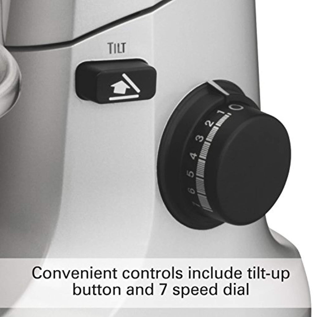 • Splash guard, dough hook, whisk and flat beater included. For more mixing versatility.