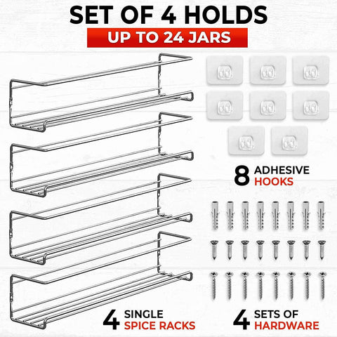 Hanging Spice Rack Organizer - Wall Mount Spice Rack - Cabinet Door Spice Rack - Seasoning Rack - Hanging Racks For Cabinet, Cupboard or Pantry Door - Spice Shelf - Set of 4 - Chrome