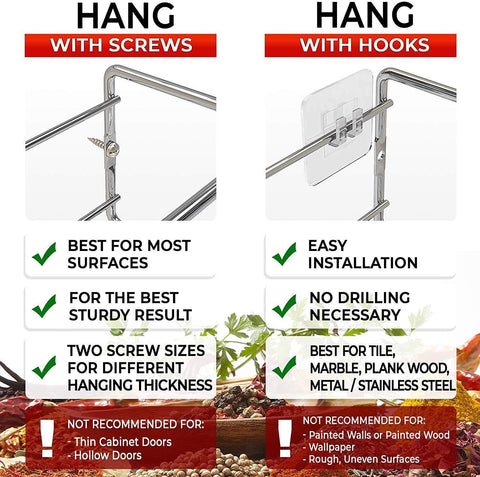 Easy Mounted Spice Storage: The set of spice organizer contains two different sized screws (0.5/1 inch) and adhesive hooks for installation wall spice racks without drilling