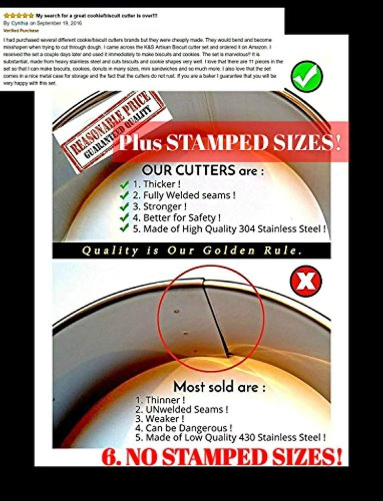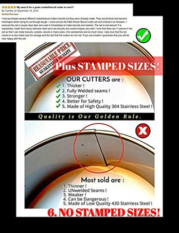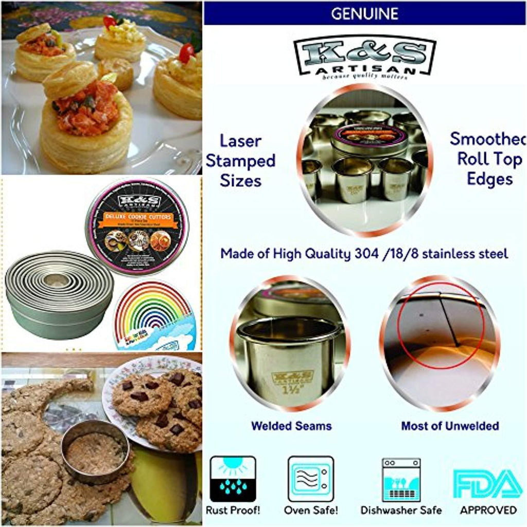 • ✅ EACH CUTTER IS NUMBERED multiple circular rings shape cutters/ are Commercial Grade Made from Heavy Duty 304 (18/8) Stainless Steel unlike other starting brands use lower quality stainless steel●✔ NO RUST ●✔Dishwasher safe ●✔ BEAUTIFUL storage tin ●✔No more Clutter!●✔Fully stainless steel Rolled top edges to protect fingers making it ●✔comfortable to use ●✔ FULLY WELDED SEAMS.Our cutters have ●✔ No sharp dangerous seams at Perfect Height 1.25" ✅FREE Biscuit & cake eBook recipes and much more!