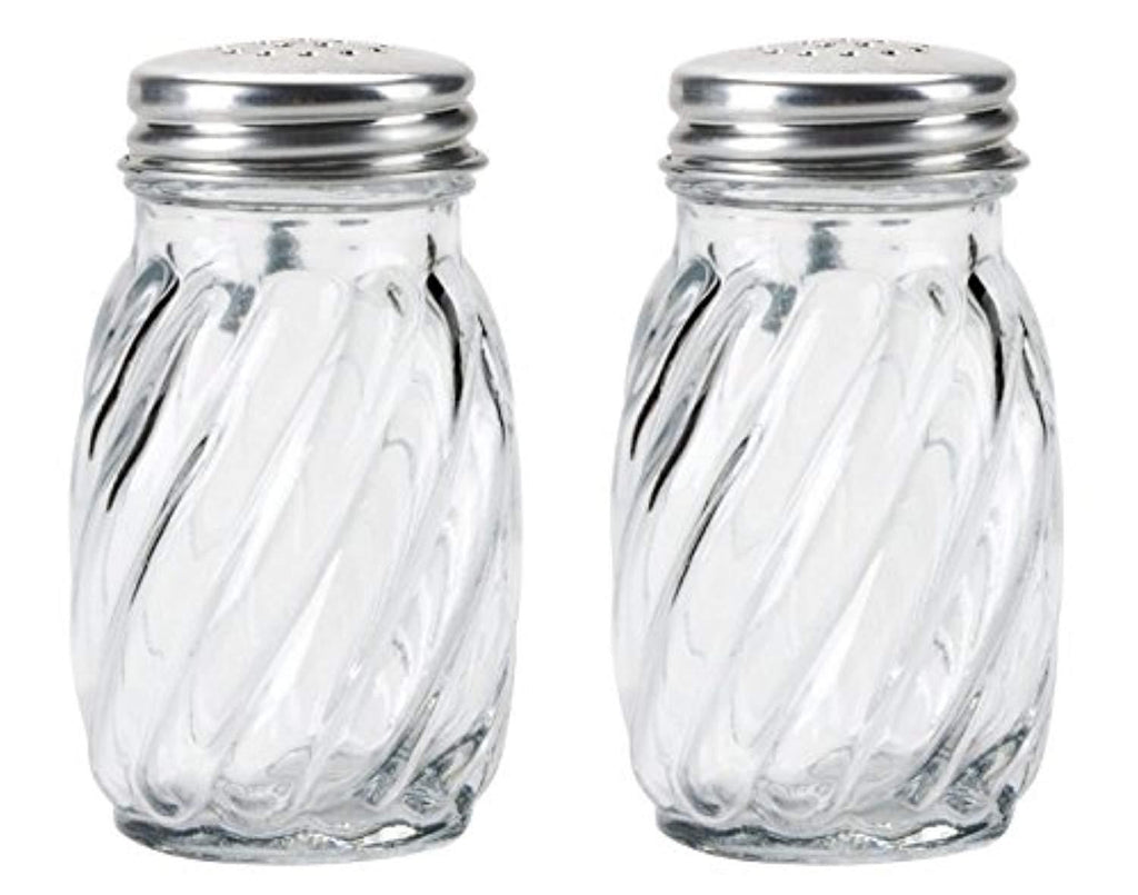 (Set of 2) Salt & Pepper Shakers with Screw on Stainless Steel Metal Lid Classic Crystal Glass Swirl Design Holds 3.25 oz. of Salt, Pepper or Any of Your Favorite Spices Easy-to-clean; Dishwasher Safe Shaker Measures 3.25" Tall and 1.75" in Diameter