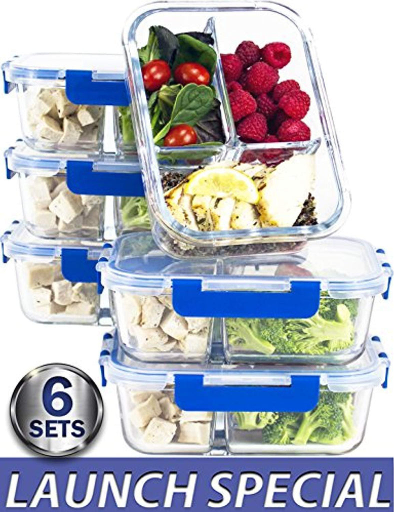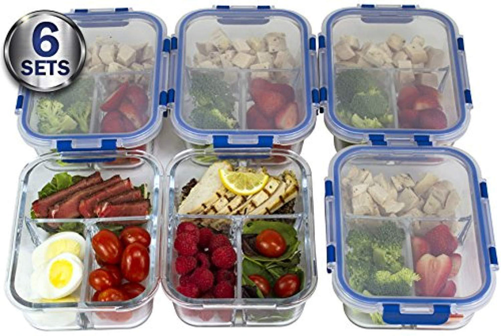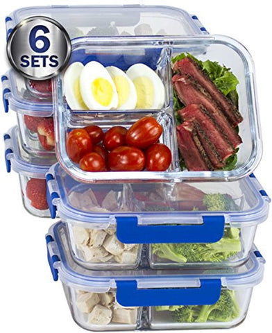 • PERFECT SIZE & BEST VALUE – 12 Piece Set 6 Three Compartment glass food storage containers and 6 snap locking lids, we guarantee we have the best quality products at the best price. 6- 36 Oz (4.5 Cups), 8” x 6.5” x 3” main compartment 2 Cups and small compartments 1.25 cups each, easy for meal prepping, saves space, and travels easily