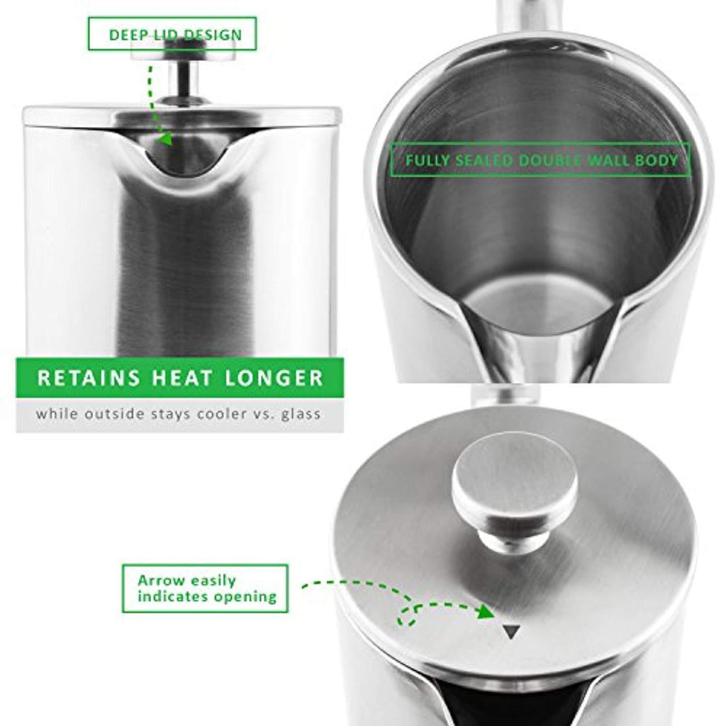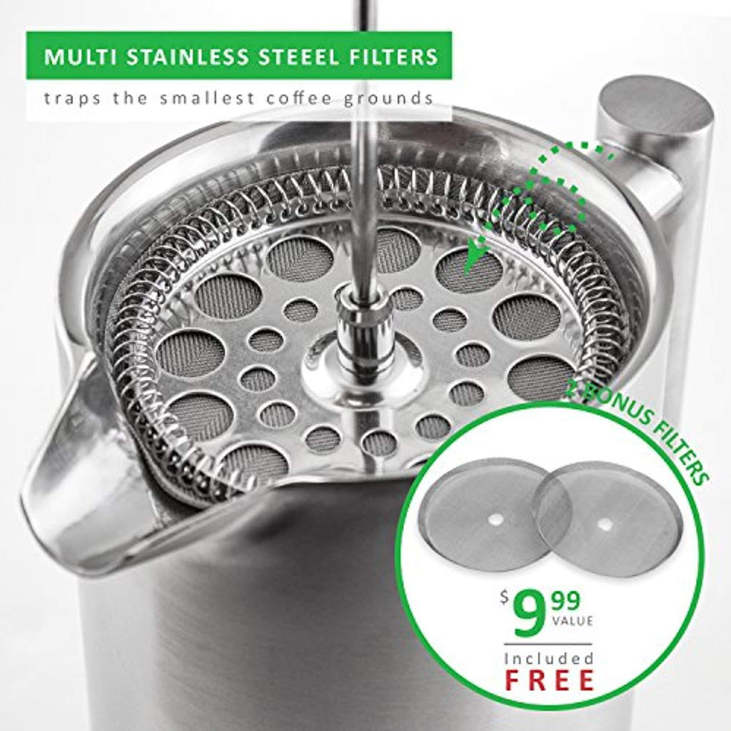 Easy to Use - Classic French coffee press for the coffee enthusiast with minimal parts for easy use and easy clean up Eco-Friendly - Never buy coffee filter paper again with the reusable stainless steel filter screen system (Two bonus screens included) Shatterproof - No more broken French press carafes with durable double wall construction consisting of corrosion resistant food grade stainless steel Beautiful Design - An elegant coffee maker to add to your kitchenware collection with its brushed steel finish to mask fingerprint smudges Shop with Confidence - Our French press is backed by a 2-year guarantee and product warranty after registration