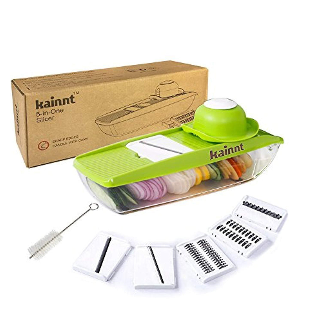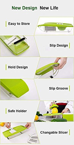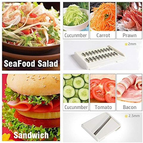 5 Interchangeable Stainless Steel Blades---We put 5 different Interchangeable Stainless Steel Blades thickness slicer settings easily adjustable, it can create 5 types of vegetable slices/julienne (Slicer 2.5m&1.5mm,Julienne2.0mm&3.0mm,one Grate Blade).A perfect gift for Moms, cooks and healthy-conscious people, making their kitchen life fun and easy.