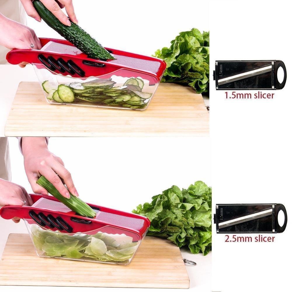 • Package included: 1 x Vegetable Chopper in size 31.5cm x 10cm x 9cm. 1 x 3.5mm/ 2.0mm/ 1.5mm/ 1.0mm slicer, 1 x wavy slicer, and 1 x grater, 1 x peeled knife, 1 x Safety Protector. Please be assured. All the vegetable chopper parts are made of high quality Eco-friendly material, bring you the safe and healthy promise. Meet your daily needs.
