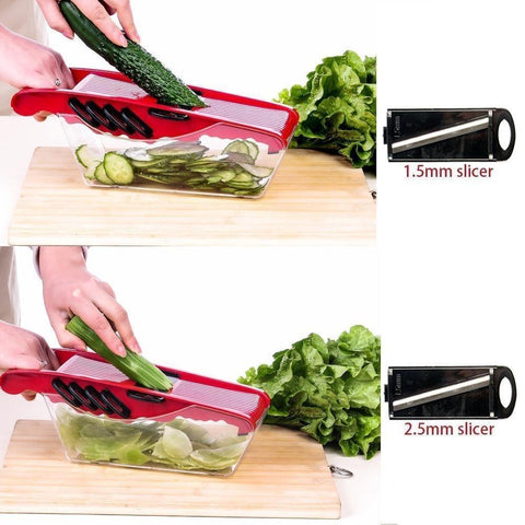• 6-in-1 Food Chopper Slicer: Our Vegetable Chopper will make chopping easier & fun for you. Free-up your kitchen space and enjoy a variety of healthy meals with this slicer. It is perfect for a wide variety of vegetables - cucumber, onion, carrot, potato, tomato, zucchini, cabbage, fruit, cheese & more. Please note it is not suitable for hard vegetable such as sweet potatoes.