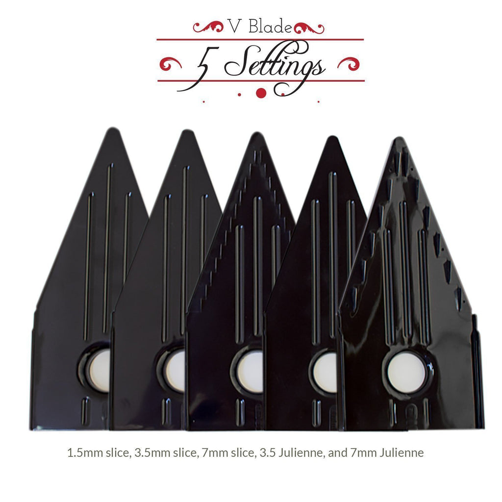 5-IN-ONE CUTTING SYSTEM: 1.5mm slice (1/16"), 3.5mm slice (1/8"), 7mm slice (~1/4"), 3.5 julienne (1/8"), and 7mm julienne (1/4"). Great for cutting vegetables, french Fries, fruit for dehydrators, and other veggies