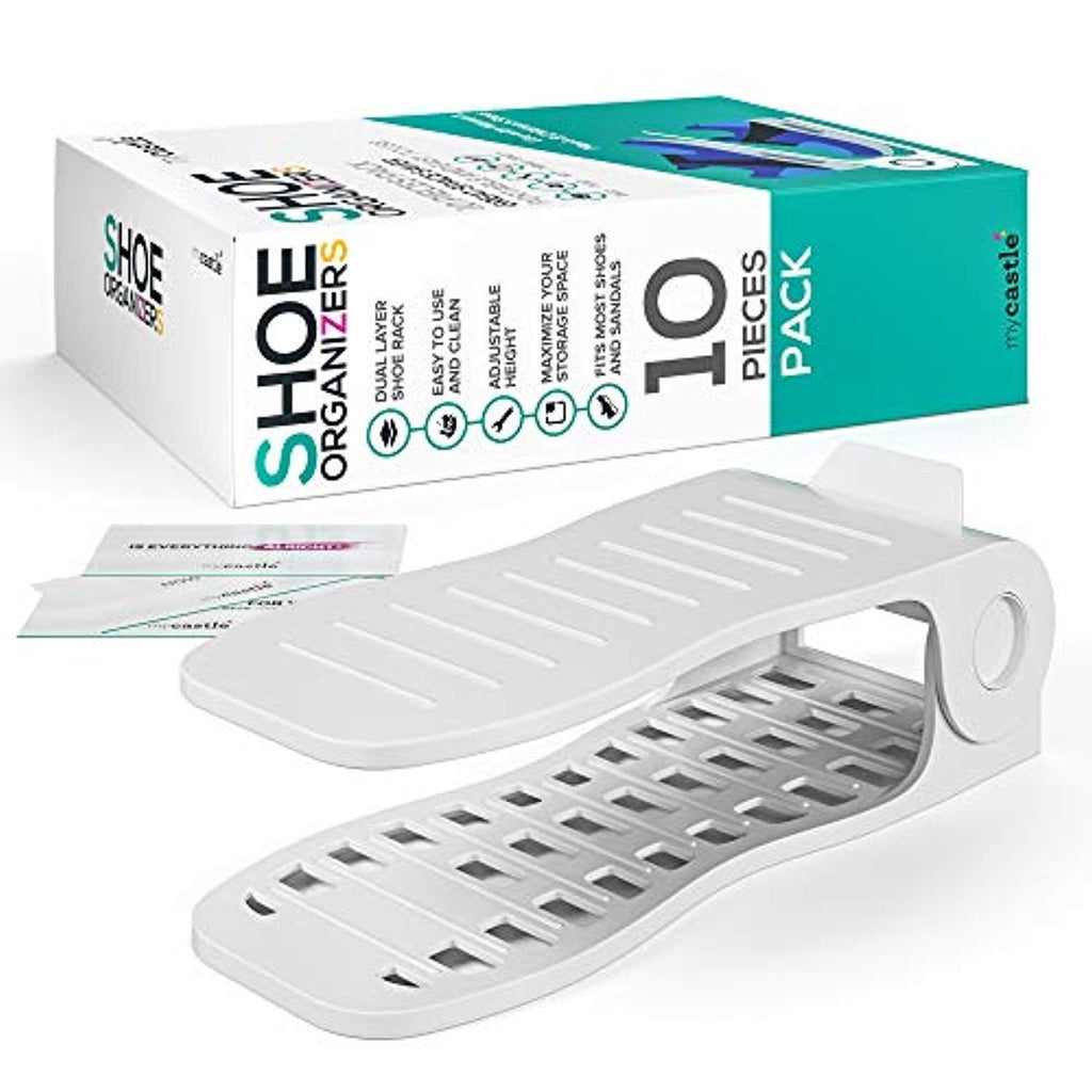 MYCASTLE 10-Pack Stacker Double Rack Storage with Extra-Thick Perfectly Balanced Organizer Slot, The Ultimate Shoe Space Saver for High Heels & Shoes, White