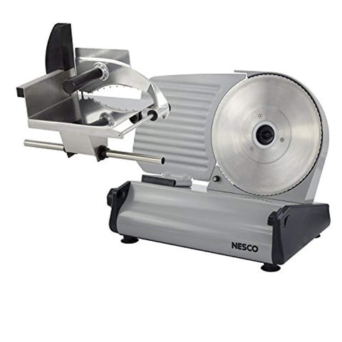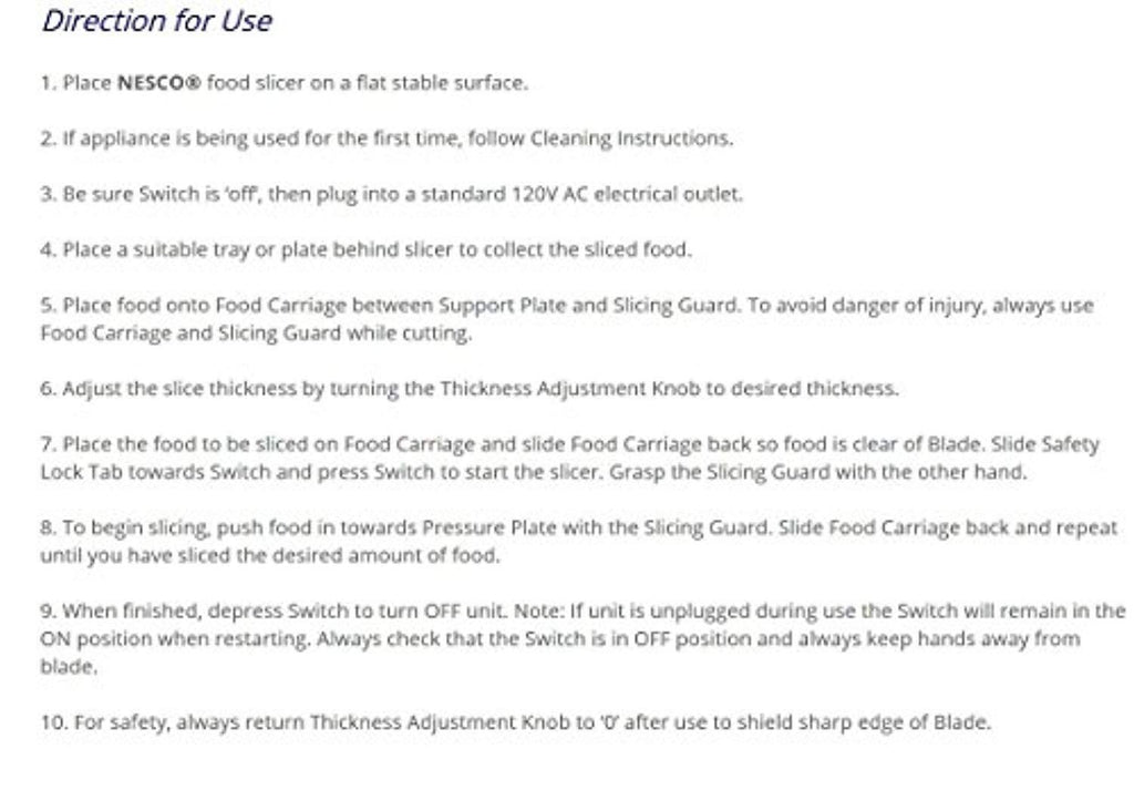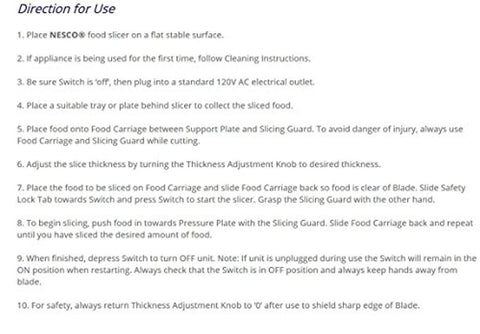 Full stainless steel sliding food carriage. 180 watt motor/120 volt. Never immerse the Motor of this appliance in water or other liquid Large, detachable 8.7" hardened stainless steel serrated blade handles a wide range of food sizes and shapes Adjustable thickness control knob for 9/16" Die cast aluminum food press Dual safety feature