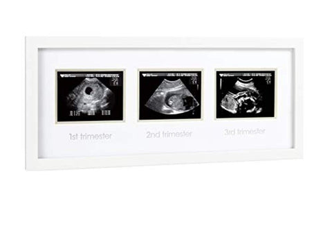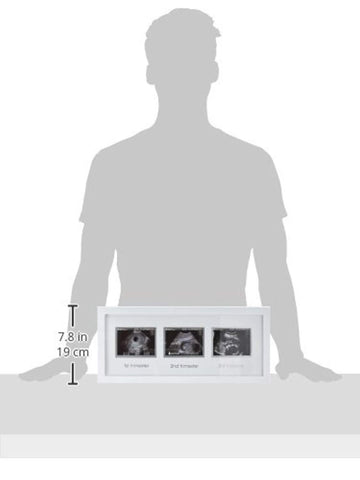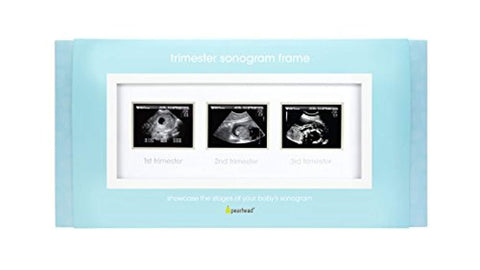 "Cherish every trimester of your pregnancy with Pearhead’s keepsake trimester sonogram photo frame. This solid white, wooden photo frame is the perfect keepsake for decorating your home or baby’s nursery. At every check-up, have fun getting your sonogram printed to then place inside your frame. The 3 photo inserts can hold a 3” x 4” sonogram photo on your adorable bundle of joy. Once the frame is filled up and baby has almost arrived, display in your home with the included easel or sawtooth hanger. The crisp white frame will make an excellent nursery decoration for any baby boy nursery or baby girl room. The white beveled mat included is decorated in a silver foil stamp with “1st trimester,” “2nd trimester,” and “3rd trimester.” The frame also includes a silver background mat to add an extra decorative touch. It’s the perfect gift for anyone expecting a baby. Keepsake frame comes in beautiful gift box packaging, any expecting parent will be happy to open this special photo frame. And don’t forget to add it to your registry! You’ll love opening this frame up at your baby shower to celebrate your pregnancy journey. Cherish every stage of your pregnancy with Pearhead’s sonogram trimester frame. Product dimensions: 17” W x 7.5” H x .63” D; Photo inserts: 3” x 4”