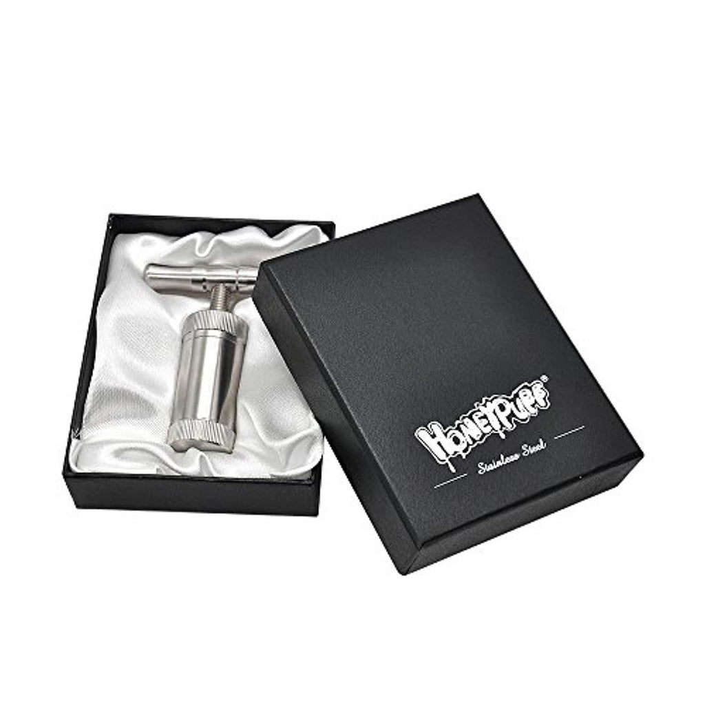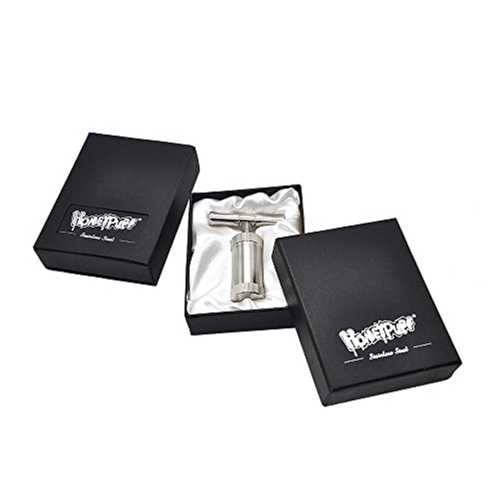Material : Stainless steel material, you can use it for a long time. Function: Many creative usages, such as portable ashtray, Pollen Press Dimension:Height 3.4 inch, diameter 1.02 inch, weight 4.25 ounce, One hand graspable easily. Quality :With a Gift Box,you can buy this for your friend as a GIFT.High quality and special shape,you can show it to your friends. Color :A fashion classic color, Polished shinning tough silver.